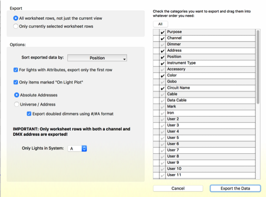 Data from the worksheet rows and categories you choose are used to help map fixture type profiles and also populate Eos query tiles, in addition to setting patch entries. Here are typical settings: