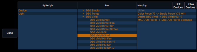 For each Lightwright column entry, click it, then scroll through the Eos column entries, opening disclosure triangles as needed, until you find the appropriate match. Click on it, then click Link Devices button to set the mapping. The mapping will appear in the Mapping column on the right. In this example, there are three Lightwright profiles mapped to Eos profiles.